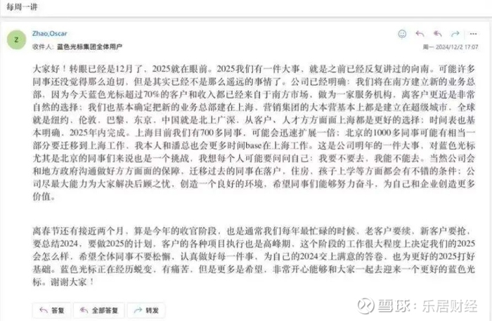 据媒体公开报道,2024年12月,A股市场“公关第一股”蓝色光标传出“南迁”的消息。一封由蓝标董事长赵文权发布的内部信在网络流传,其会在南方建立新的业务总部,原因为超过70%的客户和收入都来自南方市场。关于“南迁”的原因,内部信中称:“因为超过70%的客户和收入都来自南方市场,做为一家服务机构,离客户更近是非常自然的选择。”信中还提到,蓝色光标上海目前有700多位员工,规模可能会迅速扩展一倍,北京的1000多位员工可能有一部分会迁移去上海工作。蓝色光标证券事务代表回复记者时,“南迁”不是搬迁总部,而是将广告业务迁去上海。