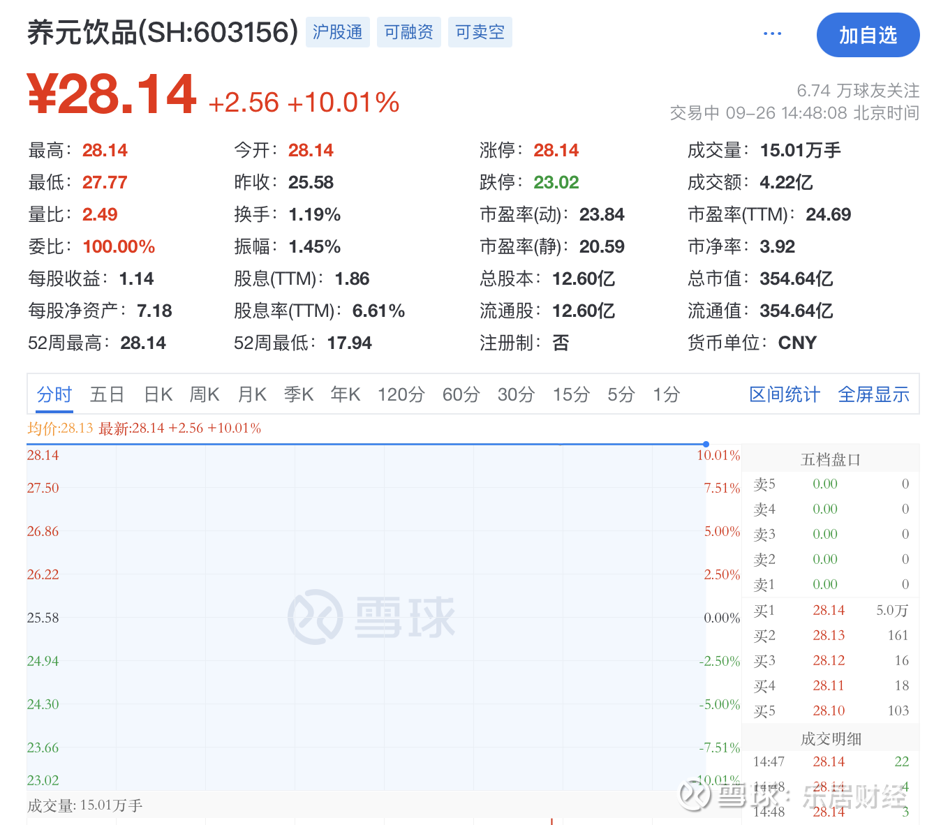 瑞财经 吴文婷 9月26日,养元饮品一字涨停,实现三连板。截至发稿时,其报28.14元,涨10.01%,总市值约354.64亿元。