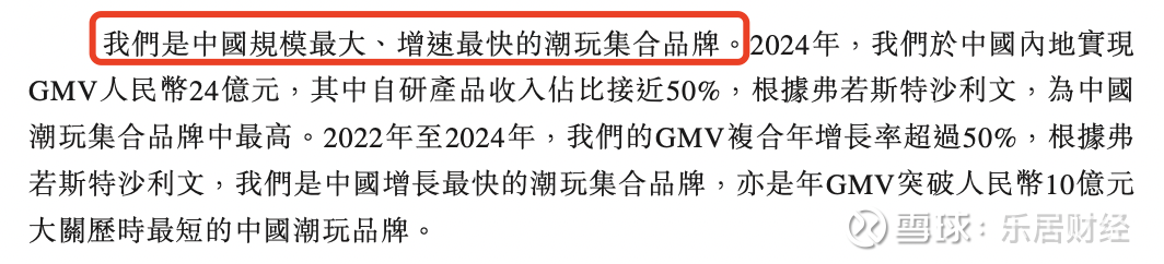 2024年,公司于中国内地实现GMV 24亿元,其中自研产品收入占比接近50%,根据弗若斯特沙利文,为中国潮玩集合品牌中最高。2022年至2024年,公司的GMV复合年增长率超过50%,根据弗若斯特沙利文,公司是中国增长最快的潮玩集合品牌,亦是年GMV突破10亿元大关历时最短的中国潮玩品牌。