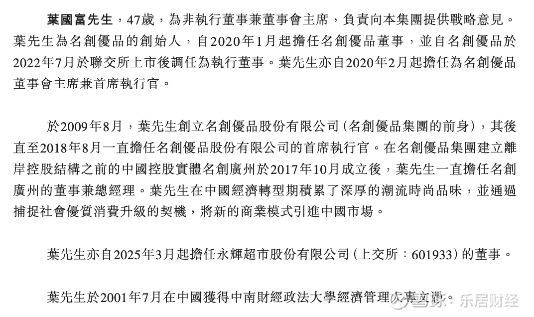 资料显示,叶国富,47岁,为非执行董事兼董事会主席,负责向集团提供战略意见。叶国富为名创优品的创始人,自2020年1月起担任名创优品董事,并自名创优品于2022年7月于联交所上市后调任为执行董事。叶国富亦自2020年2月起担任为名创优品董事会主席兼首席执行官。