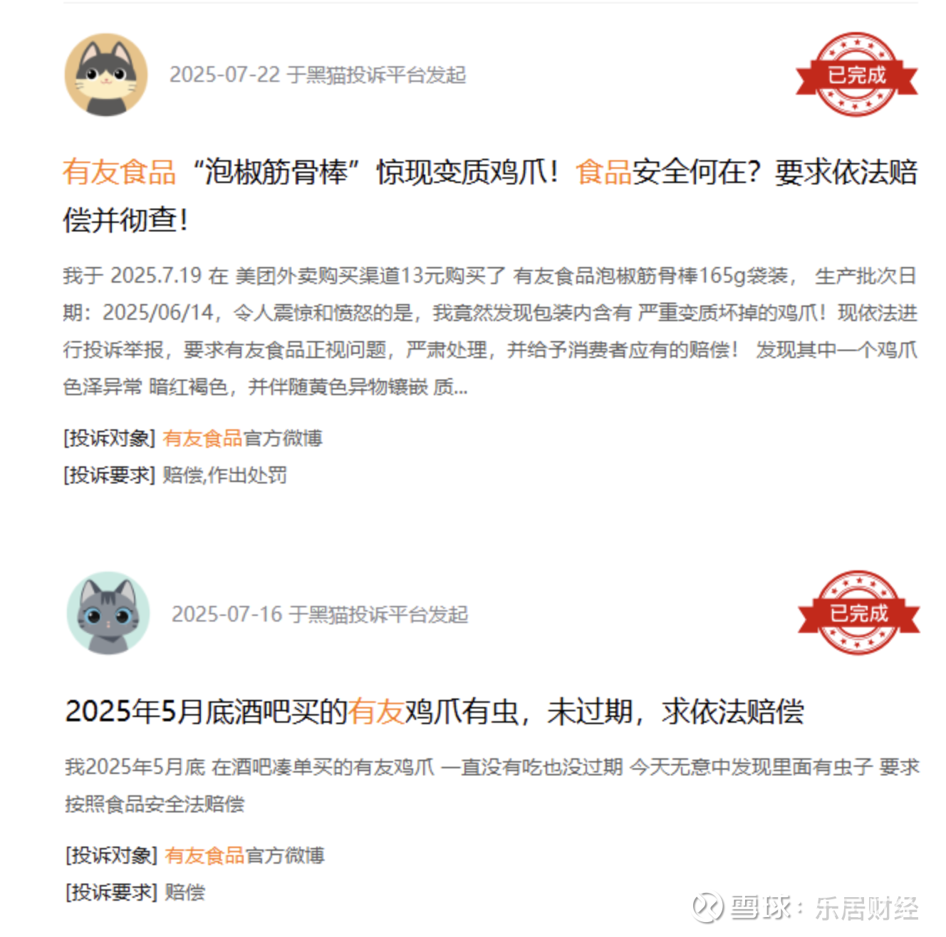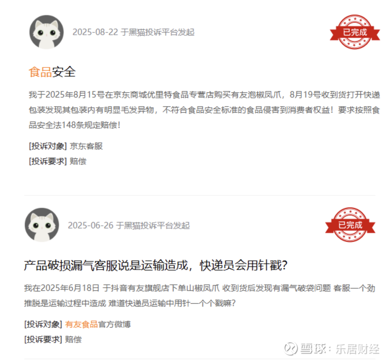 作为一家休闲食品企业,有友食品的食安问题也一直备受市场关注。《瑞消费》注意到,截至目前,黑猫投诉平台上共有143条投诉中包含搜索词“有友食品”。消费者投诉的内容主要包括花生发霉、鸡爪变质、鸡爪有虫、产品破损漏气等。同时,也存在针对山姆专供的有友产品发霉发臭、吃出异物的投诉。