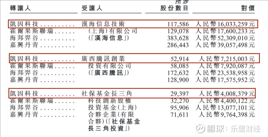 具体来看,凯因科技此次分别向美团-W(3690.HK)旗下的汉海信息、腾讯控股(0700.HK)旗下的广西腾讯及社保基金长三角投资转让了117,586股、52,914股、29,397股,合计套现约2725.66万元。