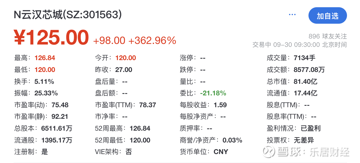 乐居财经 刘治颖9月30日,N云汉芯城(SZ301563)在深市创业板挂牌上市,保荐机构为国金证券,开盘涨362.96%,总市值81.4亿元。