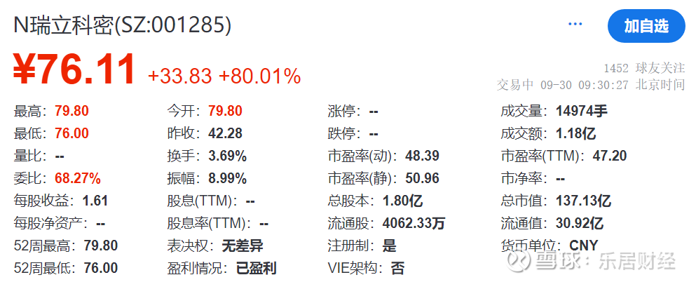 乐居财经 王敏9月30日,N瑞立科密(SZ:001285)在深交所主板挂牌上市,保荐机构为中信证券,开盘涨80%,总市值137亿元。