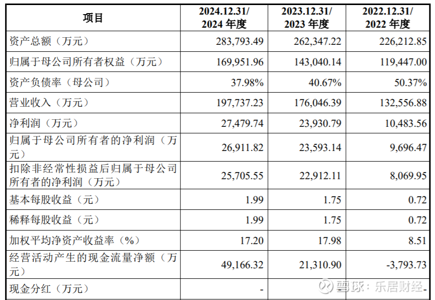 业绩方面,2022年至2024年,公司实现营业收入132,556.88万元、176,046.39万元和197,737.23万元;归属于母公司股东的净利润分别为9,696.47万元、23,593.14万元和26,911.82万元。