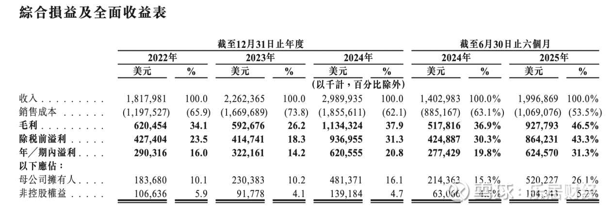 据招股书,2022年-2024年及2025上半年,紫金黄金国际实现收入分别为18.18亿美元、22.62亿美元、29.9亿美元、19.97亿美元;母公司拥有人应占年/期内溢利分别为1.84亿美元、2.3亿美元、4.81亿美元、5.2亿美元。