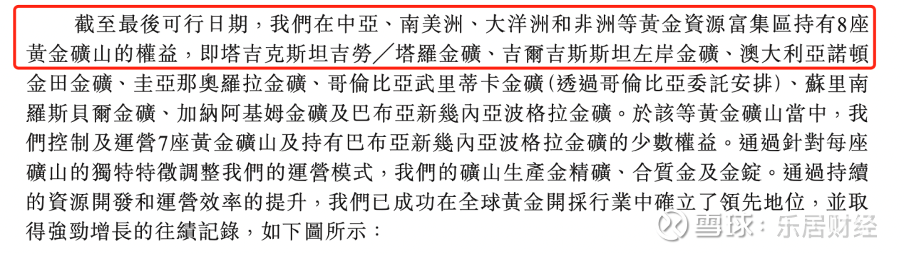 截至最后可行日期,公司在中亚、南美洲、大洋洲和非洲等黄金资源富集区持有8座黄金矿山的权益。根据弗若斯特沙利文的资料,截至2024年12月31日及2024年其黄金储量及黄金产量综合计算分别位居全球第九及第十一。