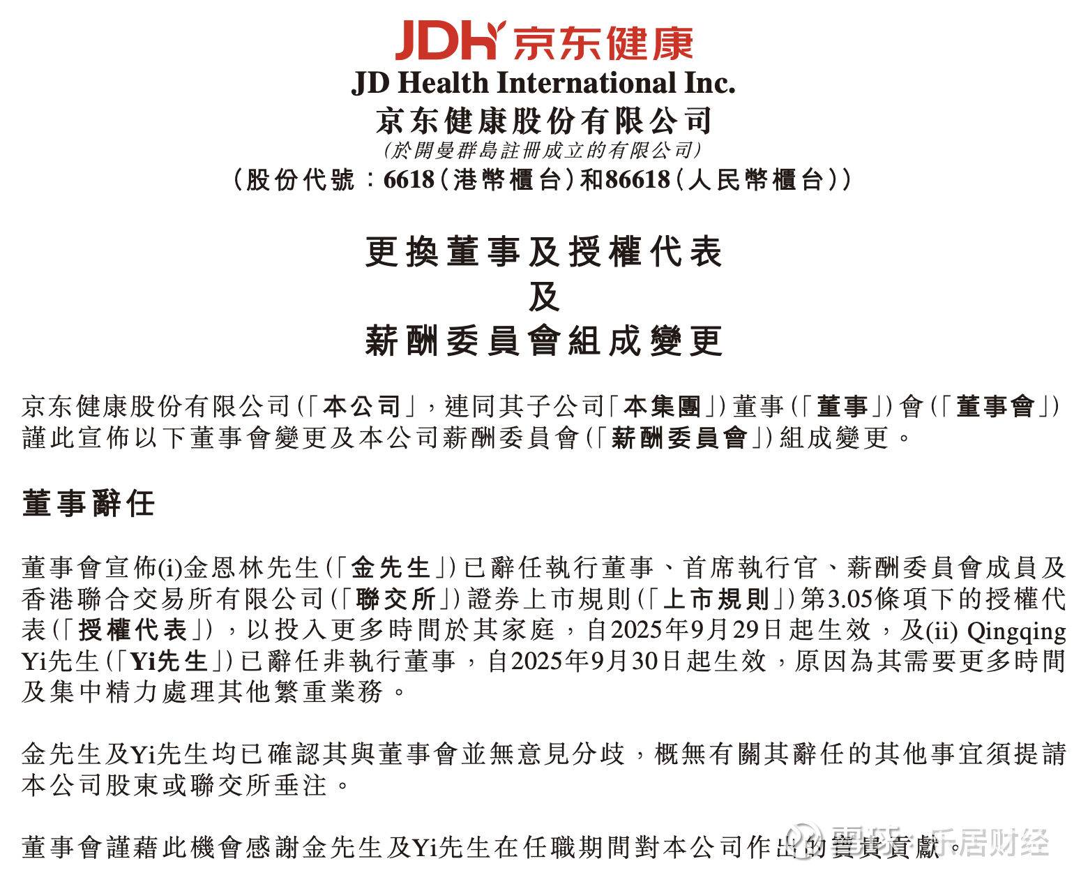 瑞财经 吴文婷 9月29日,京东健康发布公告称,金恩林已辞任执行董事、首席执行官、薪酬委员会成员及香港联合交易所有限公司证券上市规则第3.05条项下的授权代表,以投入更多时间于其家庭,自2025年9月29日起生效,及Qingqing Yi已辞任非执行董事,自2025年9月30日起生效,原因为其需要更多时间及集中精力处理其他繁重业务。