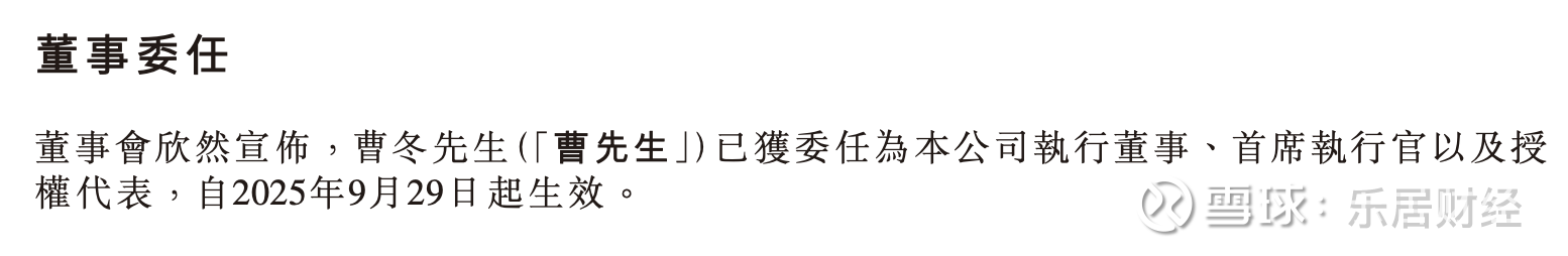 同时,董事会宣布,曹冬已获委任为公司执行董事、首席执行官以及授权代表,自2025年9月29日起生效。