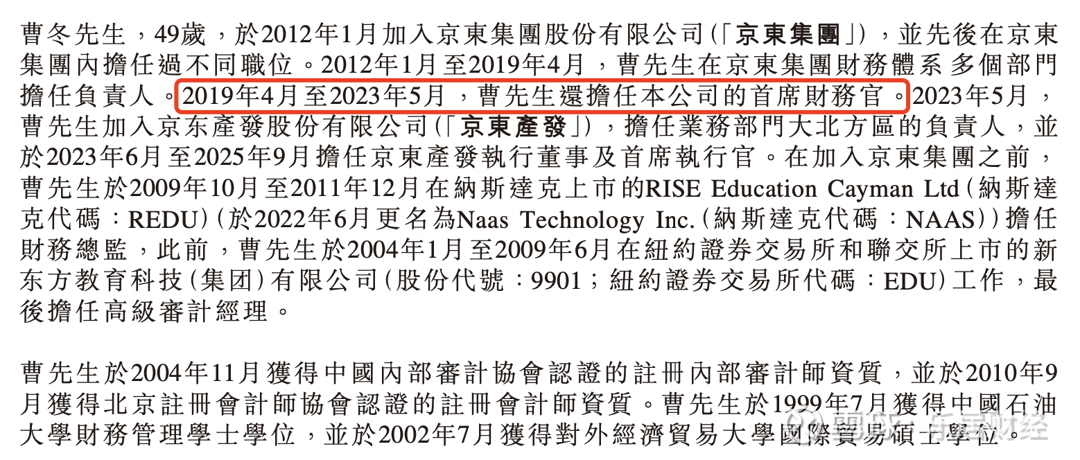 在加入京东集团之前,曹冬于2009年10月至2011年12月在纳斯达克上市的RISE Education Cayman Ltd(纳斯达克代码:REDU)(于2022年6月更名为Naas Technology Inc.(纳斯达克代码:NAAS))担任财务总监,此前,曹冬于2004年1月至2009年6月在纽约证券交易所和联交所上市的新东方教育科技(集团)有限公司(股份代号:9901;纽约证券交易所代码:EDU)工作,最后担任高级审计经理。