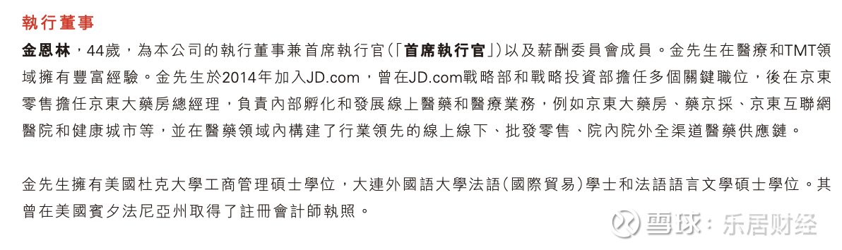 而据京东健康2024年年报显示,金恩林,44岁,为公司的执行董事兼首席执行官(首席执行官)以及薪酬委员会成员。金恩林在医疗和TMT领域拥有丰富经验。金恩林于2014年加入JD.com,曾在JD.com战略部和战略投资部担任多个关键职位,后在京东零售担任京东大药房总经理,负责内部孵化和发展线上医药和医疗业务,例如京东大药房、药京采、京东互联网医院和健康城市等,并在医药领域内构建了行业领先的线上线下、批发零售、院内院外全渠道医药供应链。