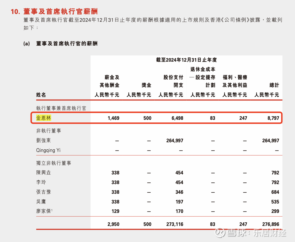 薪酬方面,2024年金恩林的薪酬总额为879.7万元,当中包含薪金及其他酬金146.9万元、奖金50万元、股份支付开支649.8万元等。