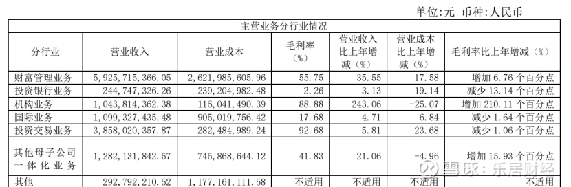 上半年,其实现财富管理业务营收59.25亿元,同比增长35.55%,占公司营业收入的43.11%,毛利率55.75%,同比增长6.76个百分点;投资银行业务营收2.44亿元,同比增长3.13%,占公司营业收入的1.78%,毛利率2.26%,比上年减少了13.14个百分点。