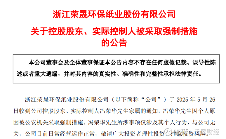 5月26日,荣晟环保发布公告称,公司于当日收到公司控股股东、实际控制人冯荣华家属的通知,冯荣华因个人原因被公安机关采取强制措施。荣晟环保表示,冯荣华所涉事项仅涉及其个人行为,与公司无关,公司目前日常经营运作正常。