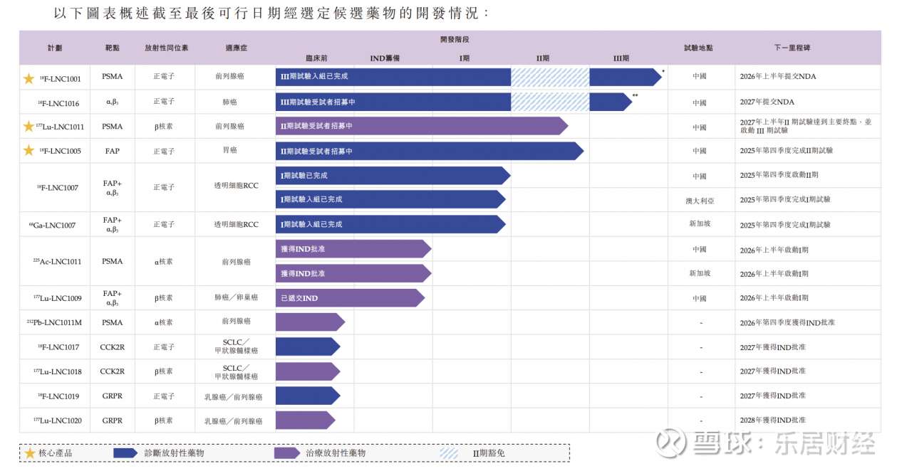 蓝纳成有3款核心产品,包括:18F-LNC1001,是一款处于注册阶段的PSMA靶向候选诊断放射性药物,开发用于PSMA阳性前列腺癌患者的正电子放射断层扫描影像;18F-LNC1005,是一款FAP靶向的候选诊断放射性药物,专为FAP阳性实体肿瘤(如胃癌)患者的PET影像而开发;及177LuLNC1011,是一款PSMA靶向治疗放射性药物,专门用于治疗PSMA阳性转移性去势抵抗性前列腺癌。
