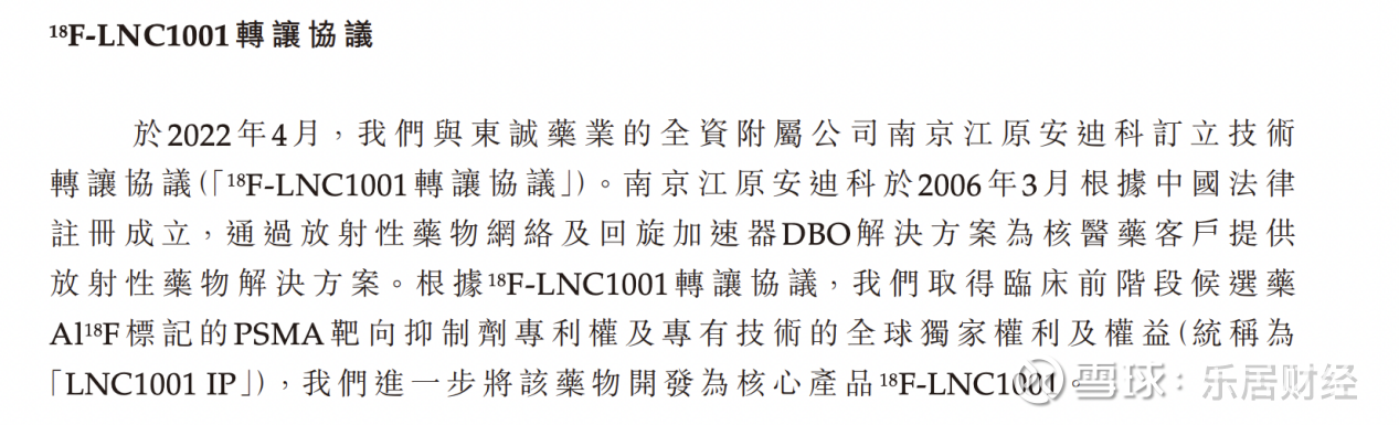 2022年4月,蓝纳成与东诚药业的全资附属公司南京江原安迪科订立技术转让协议(18F-LNC1001转让协议)。根据18F-LNC1001转让协议,蓝纳成取得临床前阶段候选药Al18F标记的PSMA靶向抑制剂专利权及专有技术的全球独家权利及权益(统称为“LNC1001IP”),公司进一步将该药物开发为核心产品18F-LNC1001。LNC1001IP源自北京大学肿瘤医院,并于2020年5月由南京江原安迪科向北京大学肿瘤医院收购。