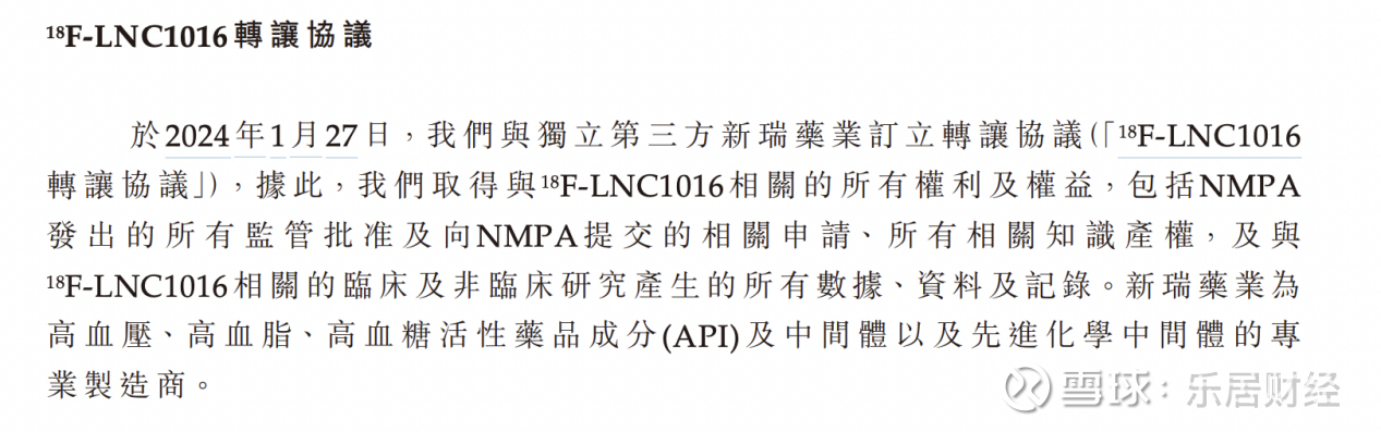 2024年1月27日,蓝纳成与独立第三方新瑞药业订立转让协议(18F-LNC1016转让协议),据此,蓝纳成取得与18F-LNC1016相关的所有权利及权益,包括NMPA发出的所有监管批准及向NMPA提交的相关申请、所有相关知识产权,及与18F-LNC1016相关的临床及非临床研究产生的所有数据、资料及记录。