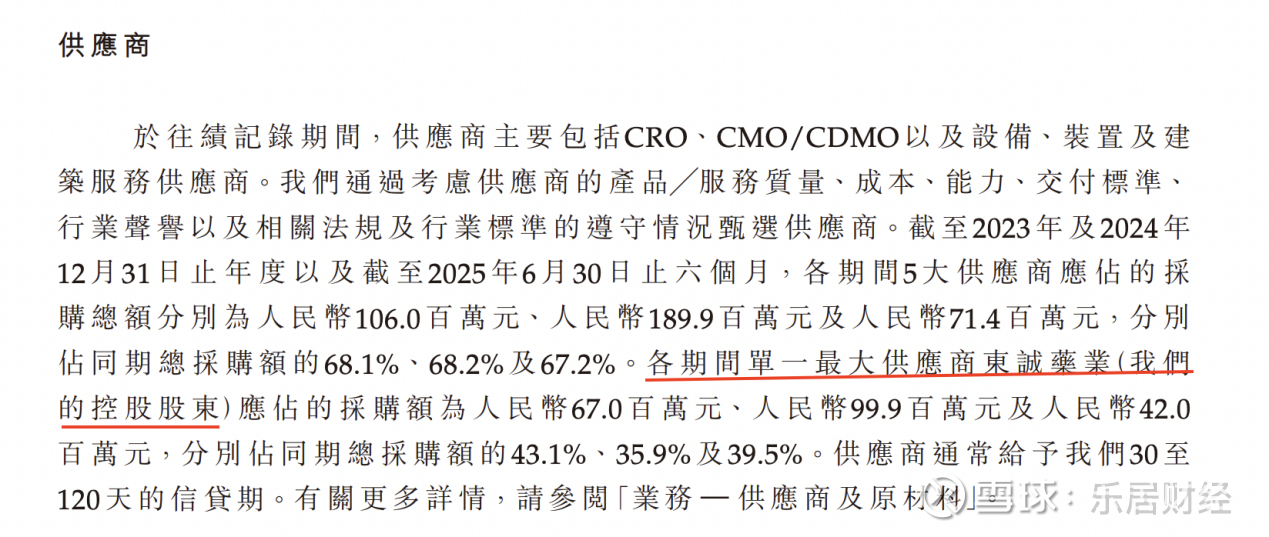 于往绩记录期间,蓝纳成供应商主要包括CRO、CMO/CDMO以及设备、装置及建筑服务供应商。截至2023年及2024年12月31日止年度以及截至2025年6月30日止六个月,各期间5大供应商应占的采购总额分别为1.06亿元、1.9亿元及7140万元,分别占同期总采购额的68.1%、68.2%及67.2%。各期间单一最大供应商东诚药业(蓝纳成的控股股东)应占的采购额为6700万元、9990万元及4200元,分别占同期总采购额的43.1%、35.9%及39.5%。供应商通常给予公司30至120天的信贷期。
