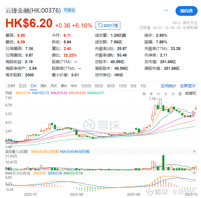 瑞财经 李兰 10月3日,截至收盘,云锋金融(00376.HK)股价报6.2港元,涨6.16%。