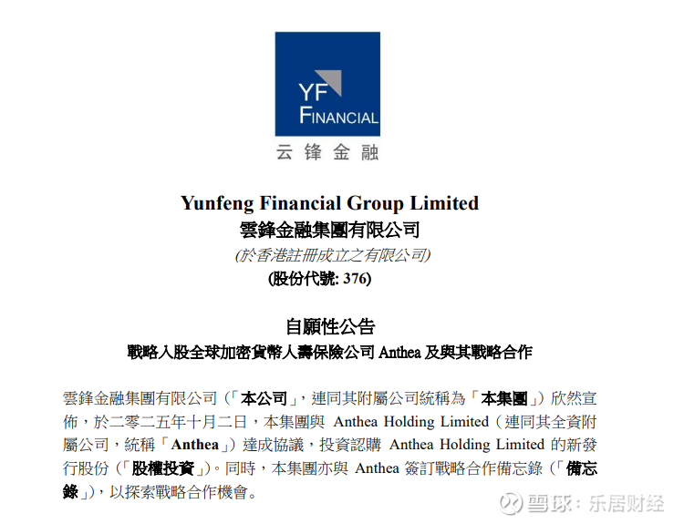 云锋金融发布公告,战略入股全球加密货币人寿保险创新平台Anthea Holding Limited,双方签订战略合作备忘录,以探索战略合作机会。