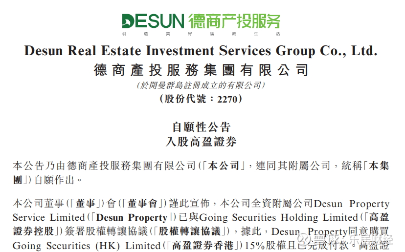 据德商产投服务公告,公司全资附属公司Desun Property Service Limited(“Desun Property”)已与Going Securities Holding Limited(“高盈证券控股”)签署股权转让协议。