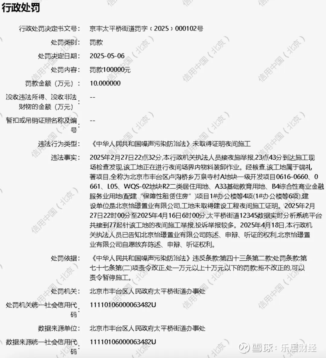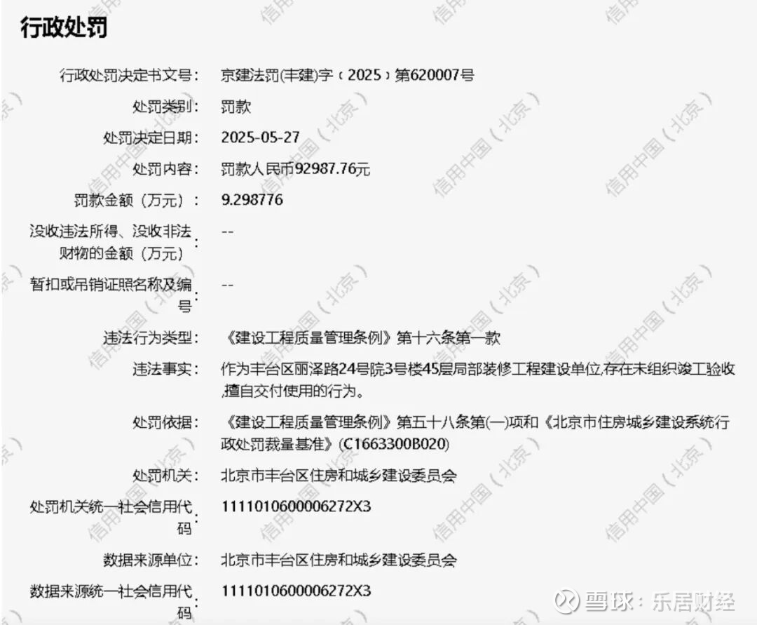 更早的5月,君礼著项目公司,因为作为丰台区丽泽路24号院3号楼45层局部装修工程建设单位,存在未组织竣工验收,擅自交付使用的行为,被丰台住建委罚款92,987.76元。