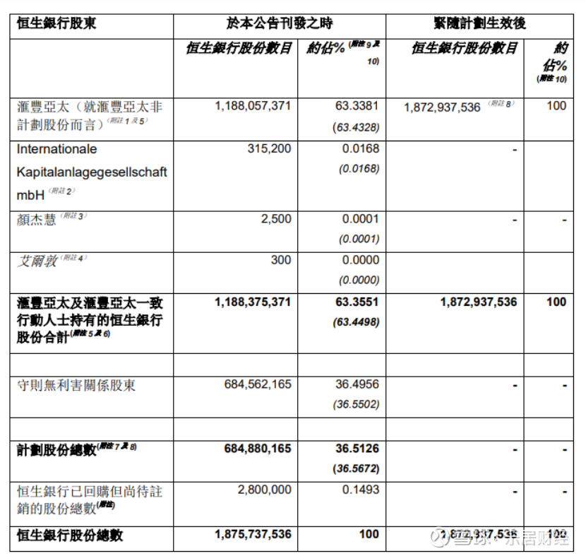股权架构上,恒生银行已发行股份18.757亿股,汇丰亚太及其一致行动人持股63.36%,计划股份总数为6.8488亿股。