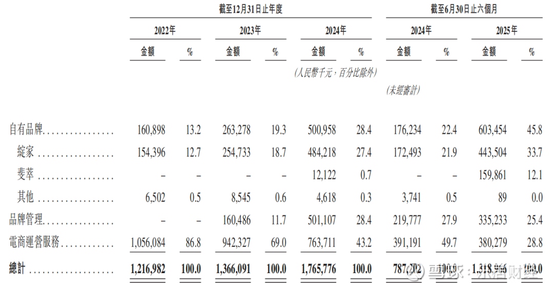 2025年上半年,若羽臣已经有45.8%的收入来自自有品牌,同比增加了23.4个百分点。其自有品牌中,又以绽家表现最为突出。