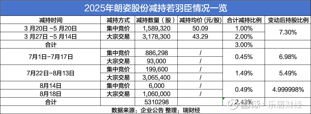 2025年5月22日,若羽臣公告,朗姿股份通过集中竞价和大宗交易分别减持258.93万股和317.83万股,分别套现7960.90万元、1.38亿元,合计减持比例3%,合计套现2.17亿元,持股比例从10.3%降至7.3%。