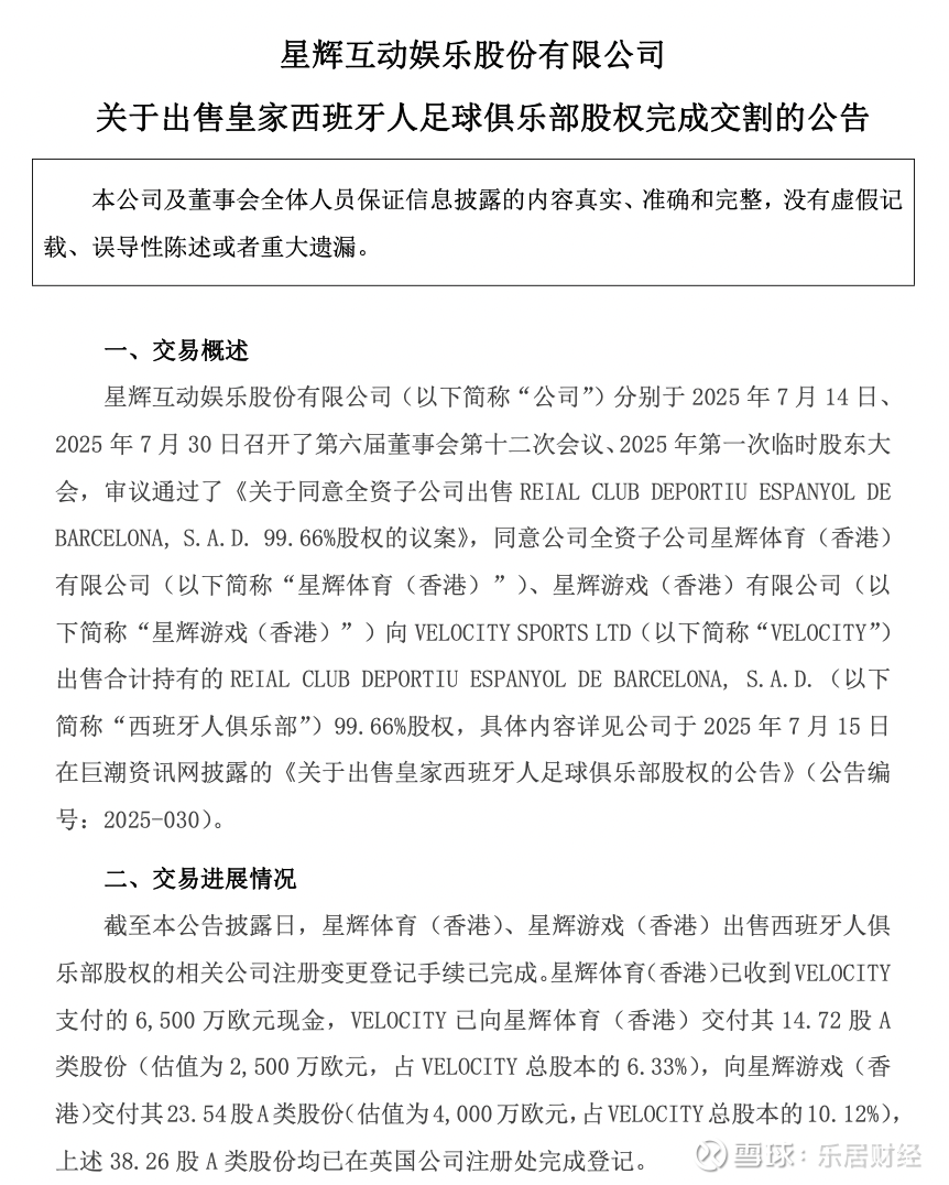 据了解,星辉娱乐分别于2025年7月14日、2025年7月30日召开了第六届董事会第十二次会议、2025年第一次临时股东大会,审议通过了《关于同意全资子公司出售REIAL CLUB DEPORTIU ESPANYOL DE BARCELONA, S.A.D. 99.66%股权的议案》,同意公司全资子公司星辉体育(香港)、星辉游戏(香港)向VELOCITY出售合计持有的西班牙人俱乐部99.66%股权