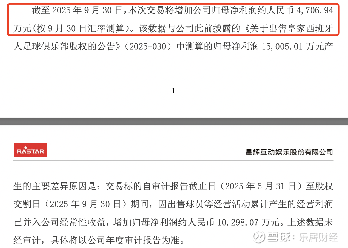 该数据与公司此前披露的《关于出售皇家西班牙人足球俱乐部股权的公告》(2025-030)中测算的归母净利润15,005.01万元产生的主要差异原因是:交易标的自审计报告截止日(2025年5月31日)至股权交割日(2025年9月30日)期间,因出售球员等经营活动累计产生的经营利润已并入公司经常性收益,增加归母净利润约10,298.07万元。上述数据未经审计,具体将以公司年度审计报告为准。