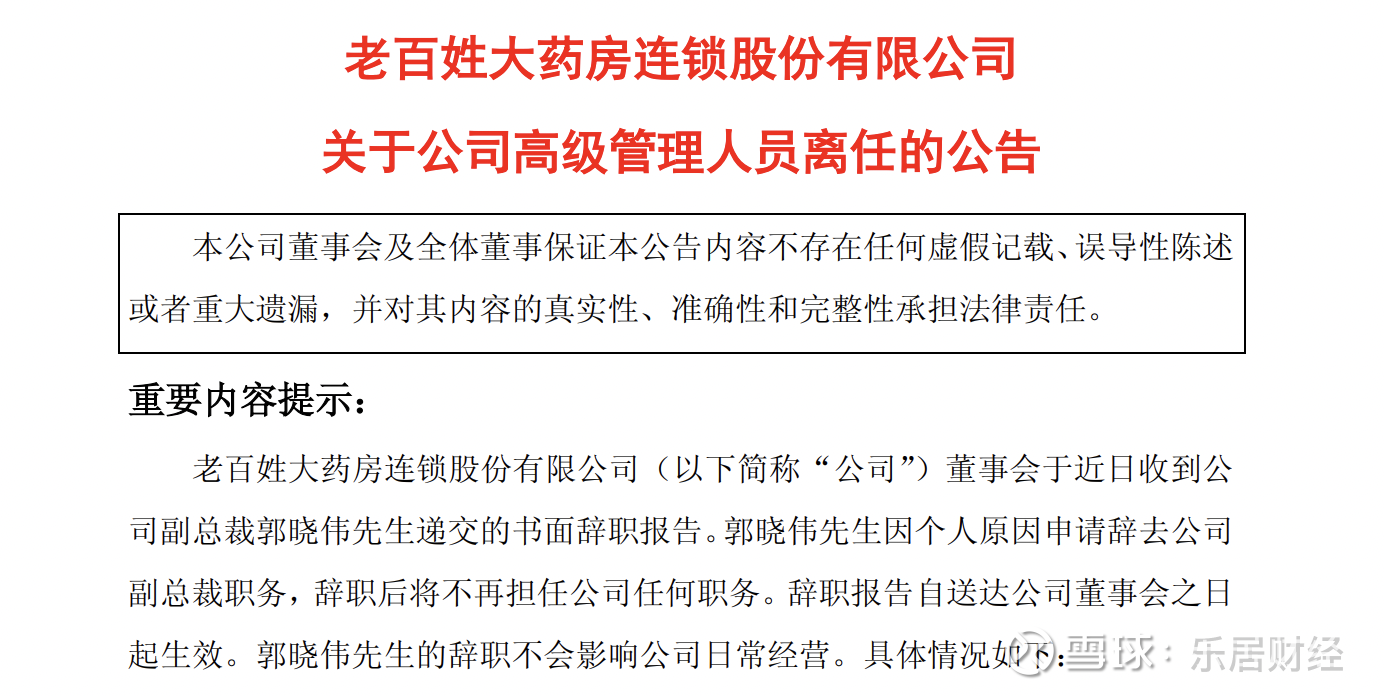 瑞财经 刘治颖10月10日,老百姓(SH603883)发布公告,郭晓伟因个人原因申请辞去公司副总裁职务,辞职后将不再担任公司任何职务。离任时间为2025年10月10日,原定任期到期日为2027年2月21日。