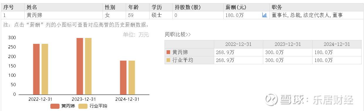 据东方财富网数据,广东明珠董事长黄丙娣2024年所获薪酬为180万元,相较上年薪酬300万元降薪四成。