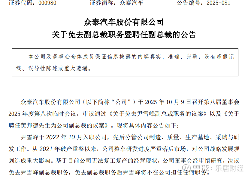 公告显示,众泰汽车10月9日召开第八届董事会2025年度第八次临时会议,审议通过两项重要人事议案。会议决定免去尹雪峰副总裁职务。同时,为满足公司经营及战略发展需要,董事会决议聘任黄邦德为公司副总裁,任期与公司第八届董事会任期一致。