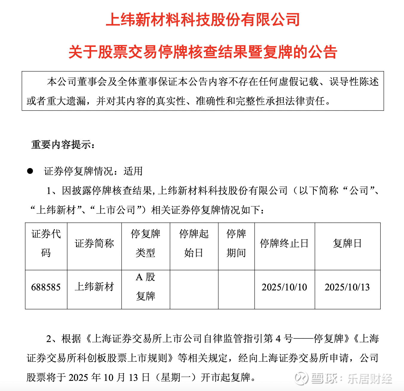瑞财经 吴文婷 10月10日,上纬新材发布公告称,经向上海证券交易所申请,公司股票将于2025年10月13日(星期一)开市起复牌。