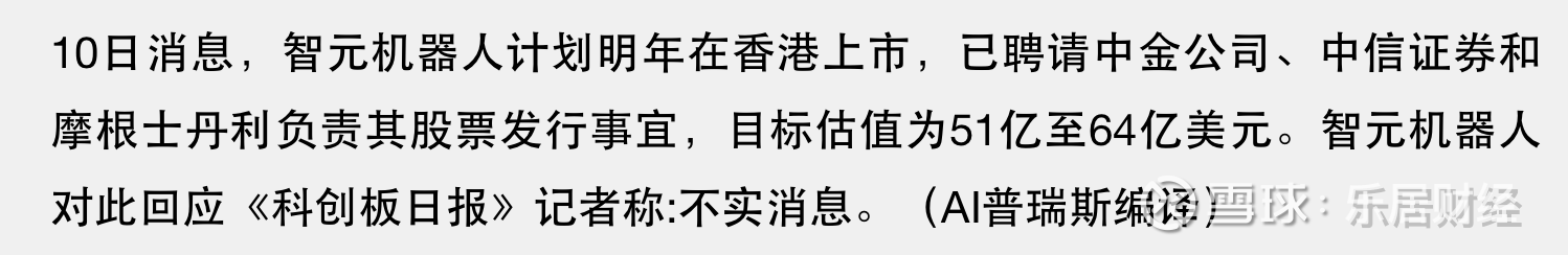 当日,市场消息称,智元机器人计划明年在香港上市,已聘请中金公司、中信证券和摩根士丹利负责其股票发行事宜,目标估值为51亿至64亿美元。智元机器人对此回应称:不实消息。