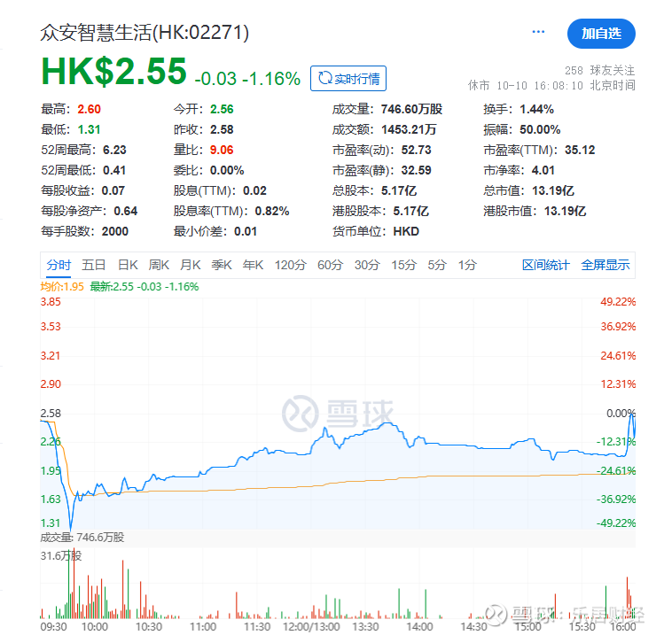 乐居财经 李兰10月10日,众安智慧生活(02271.HK)早盘从2.5港元的开盘价一度跌至1.31港元,最大跌幅达47%,尾盘收复2.55港元,单日振幅达50%,市值一度蒸发超6亿港元。