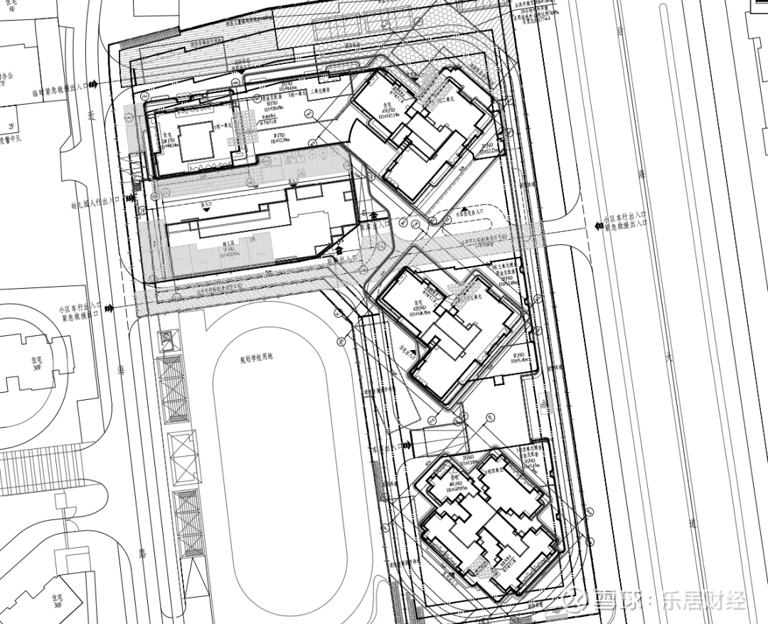 总平图显示,主要有四栋住宅楼和一栋幼儿园。