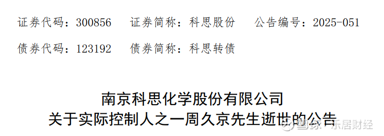 瑞财经 钟鸣辰 10月10日晚,科思股份(SZ300856)发布公告称,公司实际控制人之一周久京近日因病不幸逝世,享年82岁。