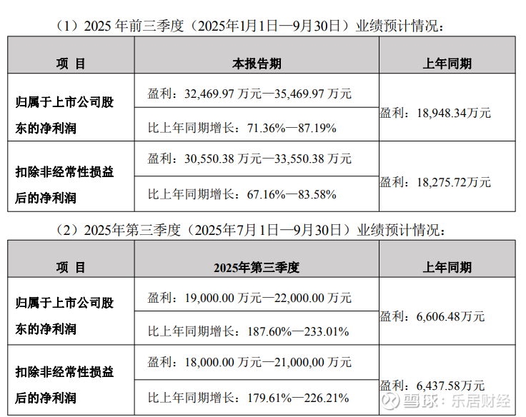 其中,中泰股份2025年第三季度归属于上市公司股东的净利润预计盈利1.90亿元 - 2.20亿元,较上年同期的0.66亿元增长187.60% - 233.01%;扣除非经常性损益后的净利润预计盈利1.80亿元 - 2.10亿元,较上年同期的0.64亿元增长179.61% - 226.21%。