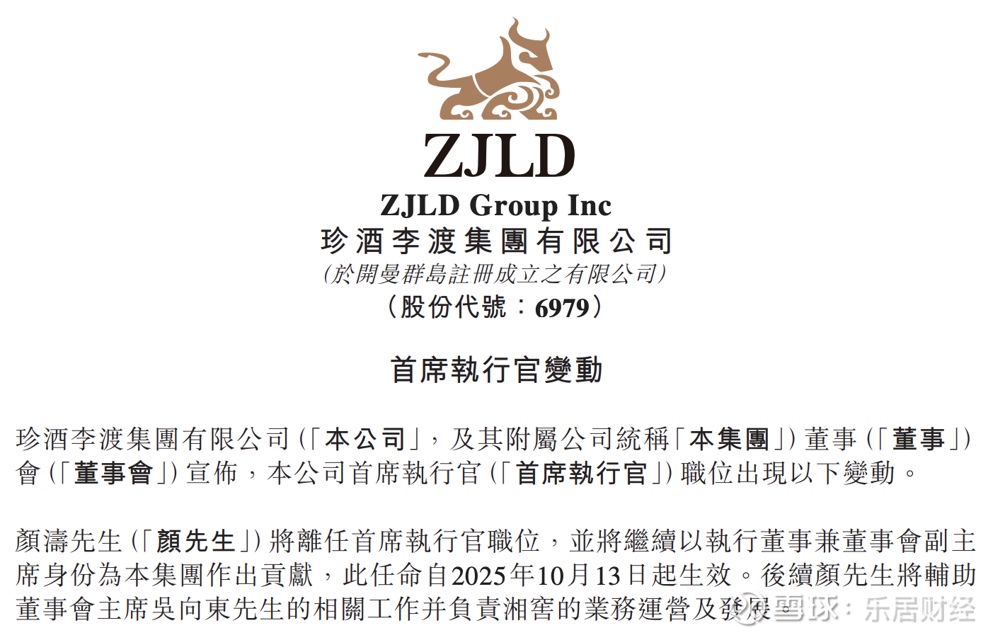 汤向阳已获委任为首席执行官,自2025年10月13日起生效。汤向阳将负责集团的整体管理及旗下子公司珍酒及李渡的业务运营及发展。