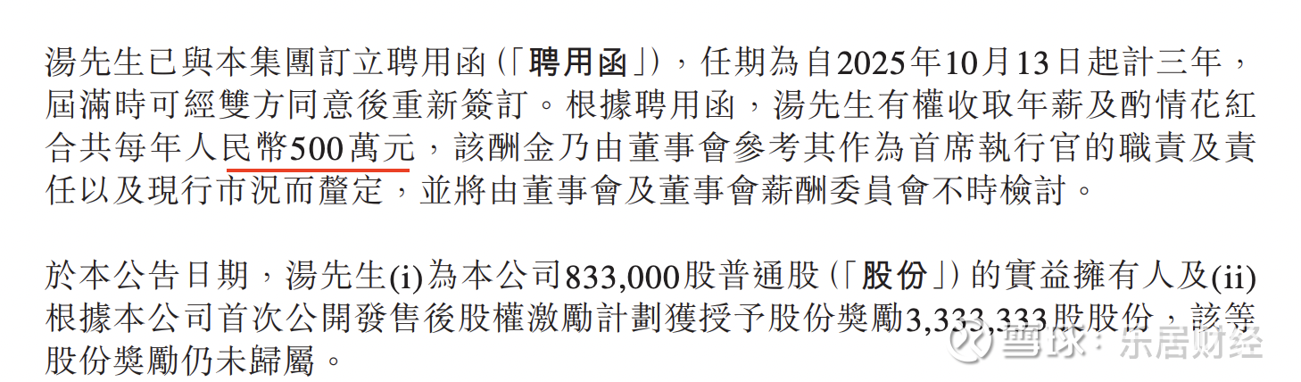 汤向阳已与珍酒李渡订立聘用函,任期为自2025年10月13日起计三年,届满时可经双方同意后重新签订。根据聘用函,汤向阳有权收取年薪及酌情花红合共每年500万元,该酬金乃由董事会参考其作为首席执行官的职责及责任以及现行市况而厘定,并将由董事会及董事会薪酬委员会不时检讨。