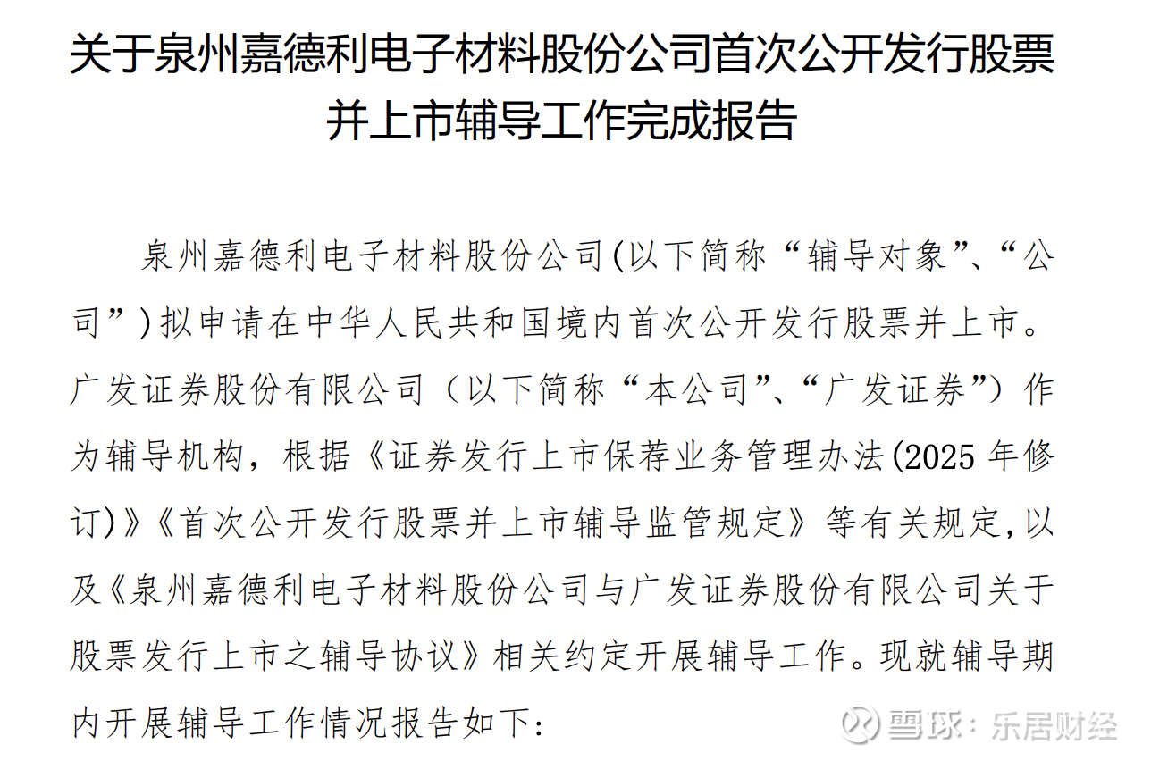 瑞财经 刘治颖近日,泉州嘉德利电子材料股份公司(以下简称:嘉德利)披露关于首次公开发行股票并上市辅导工作完成报告,广发证券为辅导机构。
