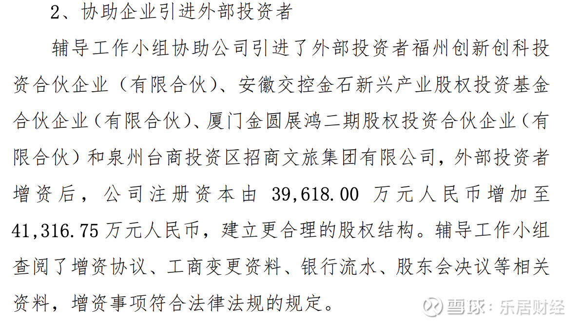 根据报告,第二期辅导阶段,辅导工作小组协助嘉德利引进了外部投资者福州创新创科投资合伙企业(有限合伙)、安徽交控金石新兴产业股权投资基金合伙企业(有限合伙)、厦门金圆展鸿二期股权投资合伙企业(有限合伙)和泉州台商投资区招商文旅集团有限公司,外部投资者增资后,公司注册资本由3.96亿元增加至4.13亿元,建立更合理的股权结构。