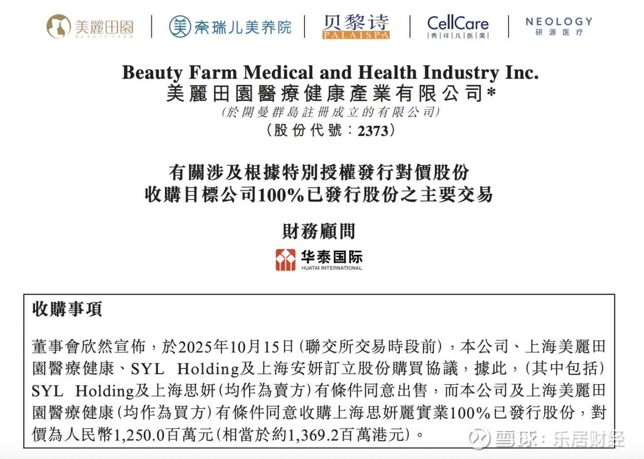 瑞财经 刘治颖10月15日,美丽田园医疗健康(02373)公告,公司、上海美丽田园医疗健康、SYL Holding及上海安妍订立股份购买协议,据此,SYL Holding及上海思妍(均作为卖方)有条件同意出售,而公司及上海美丽田园医疗健康(均作为买方)有条件同意收购上海思妍丽实业100%已发行股份,对价为人民币12.5亿元(相当于约13.69亿港元)。
