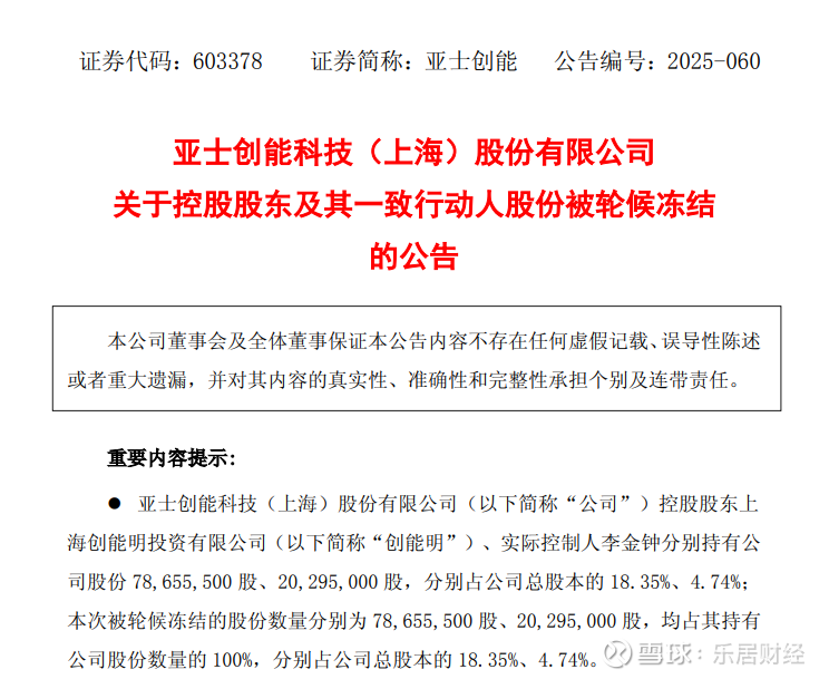 近日,亚士创能(603378.SH)发布公告,公司控股股东上海创能明投资有限公司(以下简称“创能明”)、实际控制人李金钟及其一致行动人合计持有公司2.28亿股;累计冻结股份数量2.01亿股,累计冻结股份占其持有公司股份数量的88.11%,占公司总股本的46.88%。