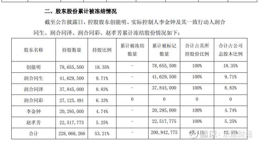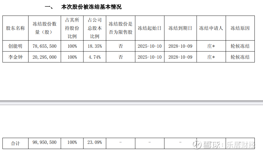 其中,创能明、李金钟本次被轮候冻结的股份数量分别为 7865.55万股、2029.5万股,均占其持有公司股份数量的100%,分别占公司总股本的18.35%、4.74%。