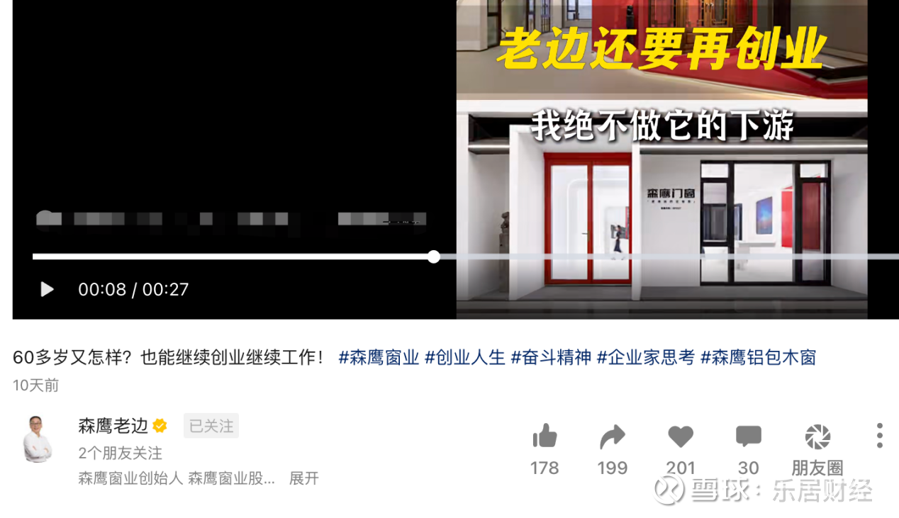 近日,森鹰窗业(301227.SZ)董事长边书平在其个人视频号“森鹰老边”中,提及“60岁又怎么样?也能继续创业工作!”。