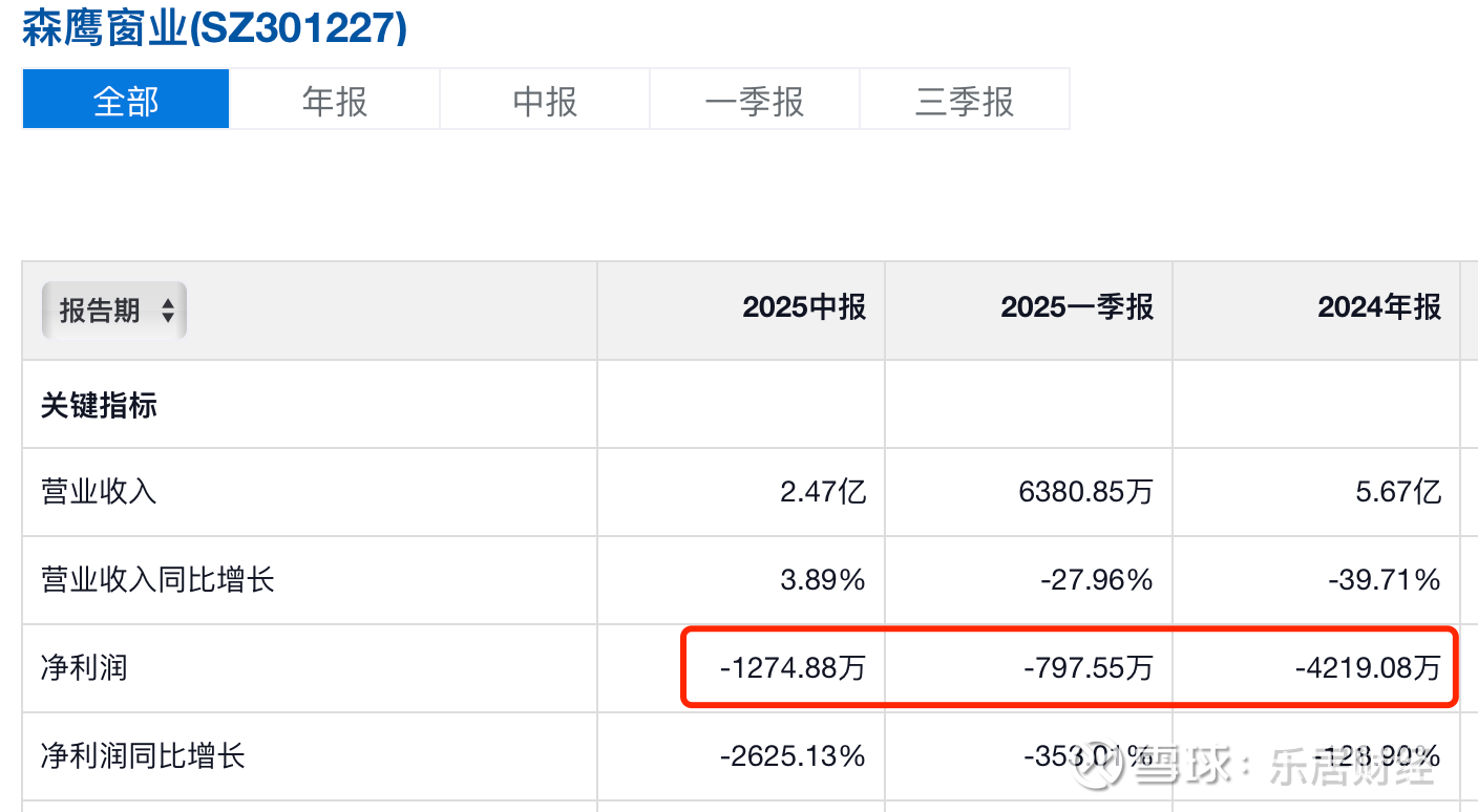 2025年一季度及中报,森鹰窗业延续亏损态势。其中,一季度营收同比下滑27.96%至6380.85万元,归属于上市公司股东的净利润同比下滑353.01%至-797.55万元;2025年中报披露,森鹰窗业于2025年1-6月营业总收入为2.47亿元,较去年同期增长3.89%,净利润为-1274.88万,同比大幅下滑2625.13%。