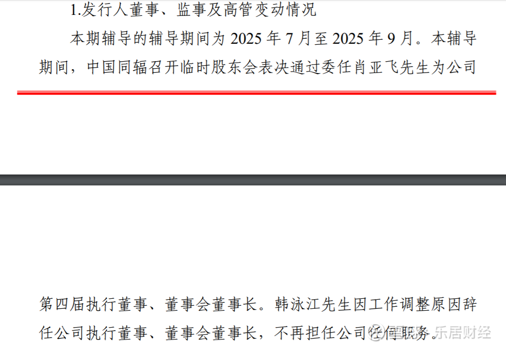 该辅导期间,中国同辐召开临时股东会表决通过委任肖亚飞为公司第四届执行董事、董事会董事长。韩泳江因工作调整原因辞任公司执行董事、董事会董事长,不再担任公司任何职务。